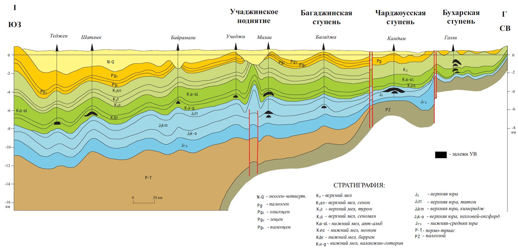 Рис.1. Амударьинский бассейн. Геологический профильный разрез по линии I-I`