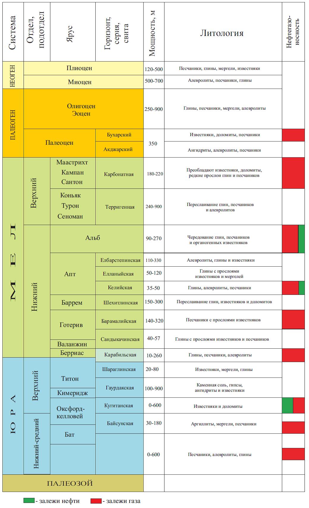 Разрез осадочного чехла начинается юрскими отложениями (рисунок 2). На значительной части Амударьинской синеклизы нижние горизонты сложены толщей переслаивающихся аргиллитов, алевролитов, песчаников. Встречаются линзы углей.