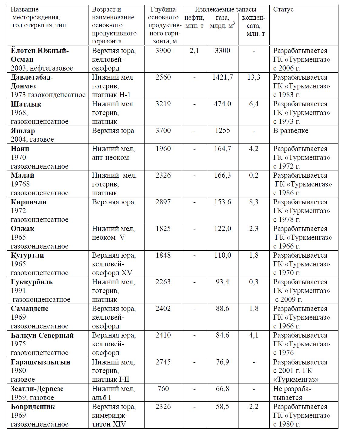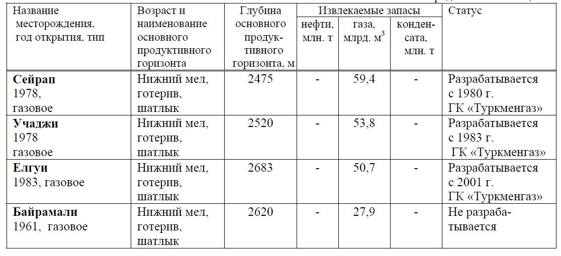 Из общего числа месторождений бассейна на долю Туркменистана приходится 141 месторождение (125 газовых и газоконденсатных и 16 нефтесодержащих). Перечень основных месторождения нефти и газа туркменской части бассейна с их краткой характеристикой приведен в таблице 1.