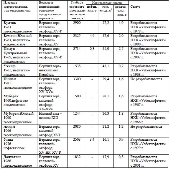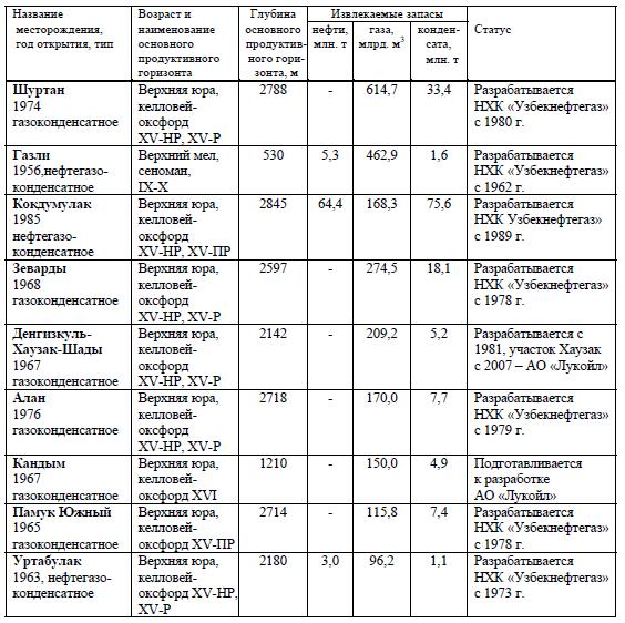 Основные месторождения узбекской части бассейна, ранжированные по запасам, с краткими характеристиками приведены в таблице 2.