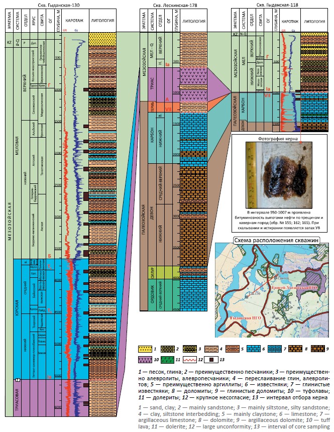 Близкие мощности девонских и нижнекаменноугольных отложений установлены по данными бурения на северной бортовой зоне Енисей-Хатанского регионального прогиба. Так, в поисковой скв. Лескинская-178 отложения девона имеют мощность свыше 1650 м (интервал глубин (2115–3770 м), а нижнего карбона — 830 м (интервал глубин 1290– 2120 м). В параметрической скв. Гыданская-118 вскрыта только верхняя часть девонских отложений мощностью 160 м (интервал глубин 1440–1600 м), а нижнекаменноугольные отложения имеют мощность 465 м (интервал глубин 975–1440 м) (рис. 1).