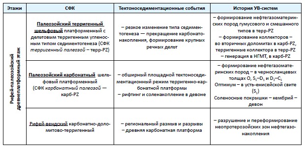 В осадочном чехле рассматриваемого региона уверенно выделяется три крупных структурных этажа, сформировавшихся в течение трех фаз тектогенеза. Первый из них — древнеплатформенный, рифей-палеозойский, представленный мощной терригенно-карбонатной толщей, близкой по своим характеристикам одновозрастным отложениям севера Сибирской платформы. Второй этаж — рифтогенный, сформированный в позднепермь-триасовое время, представленный вулканогенно-осадочными отложениями. Третий этаж — плитный, мезозой-кайнозойский, образованный терригенными толщами выполнения пострифтового палеорельефа, аналогичный одновозрастным толщам осадочного чехла Западно-Сибирской плиты (табл. 1). В составе рифей-палеозойского структурного этажа выделяется два СФК — рифей-вендский и палеозойский (см. рис.1).