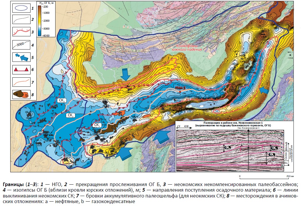 С кровлей юрского подкомплекса отождествляется сейсмический ОГ Б. Но если в центральной части Западно-Сибирской плиты этот ОГ является региональным репером, то в прибортовых частях Западно-Сибирского палеобассейна выполнить фазовую корреляцию ОГ Б достаточно сложно. Связано это с тем, что баженовская свита, сложенная плотными кремнисто-глинистыми породами, образование которой протекало в трансгрессивную фазу седиментационного цикла в условиях голодного некомпенсированного палеобассейна, фациально замещается прибрежно-морскими терригенными отложениями, составляющими единый комплекс с аналогичными неокомскими породами. В регрессивную фазу седиментационного цикла осадконакопление смещается на склоны (верхний и средний рамп), где и формируется клиноформная полициклическая дельтообразная толща, проградирующая из мелководных прибрежных обстановок осадконакопления в более глубоководные. Поэтому в зонах фациальных переходов обычно видны сложные взаимоотношения реперных (пропадающих здесь) и вспомогательных ОГ.