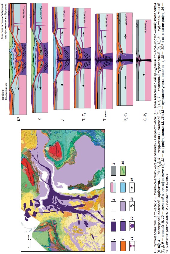 Верхнепермь-нижнетриасовый синрифтовый подкомплекс сложен вулканогенно-осадочными толщами. На рубеже палеозоя и мезозоя (Р3–Т1) произошла резкая перестройка тектонического режима. Платформенный спокойным режим сменился рифтовым, в течение которого преобладал вулканический режим, приведший к образованию мощного (более 2 км) единого (площадь более 2 млн км2) траппового покрова и других интрузивных комплексов (рис. 2). Основные излияния базальтов продолжались относительно короткое в геологическом смысле время, по экспертным оценкам не более 1–3 млн лет, но охватили весьма обширные территории Западной и Восточной Сибири и Таймыра (Сибирская трапповая провинция). За счет этих процессов была сформирована вулканическая поверхность (так называемая вулканическая печать), фиксирующая предсреднетриасовый уровень и степень тектонических деформации в регионе. В целом верхнепермь-нижнетриасовый рифтовый комплекс представлен магматическими образованиями основного и ультраосновного состава, вероятнее всего переслаивающимися с осадочно-туфогенно-вулканогенными толщами. Здесь следует отметить, что не все исследователи разделяют рифтовую модель строения центральной зоны Енисей-Хатангского регионального прогиба. Так, в статье В.А. Конторовича, Ю.Ф. Филиппова в качестве опровержения этой модели приводятся следующие аргументы: 1. «Рифтогенез должен был сопровождаться излиянием огромных масс магматических пород, которые должны были заполнять центральную, наиболее погруженную часть прогиба…» и далее 2. «Заполнение наиболее погруженной части прогиба мощными толщами пермско-триасовых базальтов, обладающих аномально высокими плотностными и магнитными свойствами, должно было породить высокоамплитудные аномалии магнитного и гравитационного полей…». Действительно, так происходит в рифтовых системах срединно-океанического хребта, где огромные массы базальтов формируют океаническую кору. Образование Енисей-Хатангской рифтовой системы происходило на Сибирском кратоне с континентальной корой, и базальтовые массы по системам разломов протыкали весь осдадочный чехол, изливаясь на дневную поверхность.