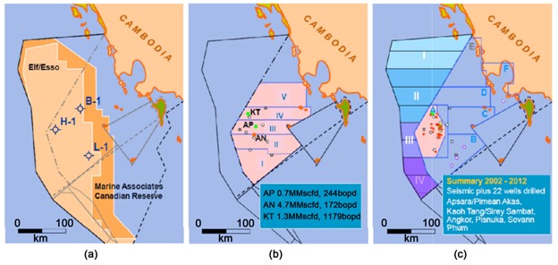 Figure 1. Block license modifications based on the continental shelf claims, geological discoveries, and hydrocarbon potential during 1972-2002. (a) Cambodia-Cambodian Shelf Concessions in 1975; (b) The seven offshore blocks after Cambodia-Russia geologists studied the geological and geophysical information to identify the basins entire the country in 1987 and (c) The offshore blocks were revised and divided into 6 blocks in 2002.