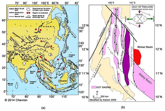 The tectonic setting of the Asia and SE Asia lead to the origin of the GoT. The period from Late Cretaceous to Eocene time, the Indo-Australian plate separated from Gondwanaland moving northward to collide with the Eurasian plate (Figure 2(a)). As the Indian subcontinent continued pushing north, SE Asia was slowly rotated clockwise, changing the angle of subduction from perpendicular orientation to increasingly oblique. This new angle formed a major thrust fault in the region which is responsible for the development of N-S extensional zones and formed the numerous N-S trending basins currently. In addition to the lateral right extension, the plate collision causes either the Indo-Australian oceanic crust subducts under the Sundaland. This subduction opened the Gulf of Thailand 50 Ma with back-arc extension transpression/transtension associated with right-lateral strike-slip faulting. Looking closer at the formation of the GoT, all basins are N-S extensional faults formation in the Cenozoic, which link up with the NNW trending Three Pagoda Transfer Fault, as shown in the Figure 2(b).