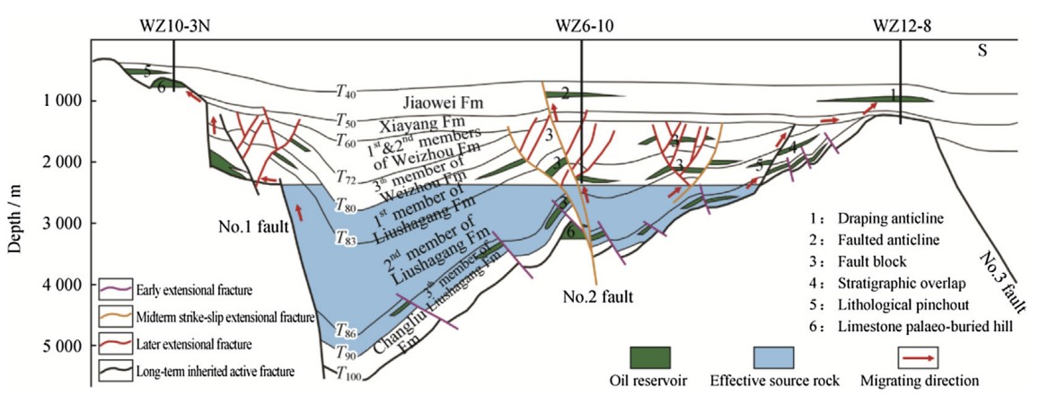 Fig. 2. Geologic section showing hydrocarbon accumulations in the Weixi'nan Sag, the Beibu Gulf Basin