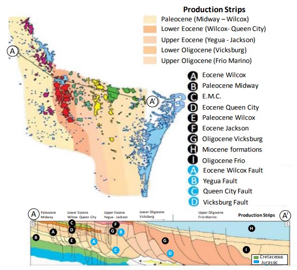 Figure 1. Upper graph shows five production strips trending approximately N-S in the Burgos basin. Lower graph shows structural cross section A-A’ (PEMEX E&P Provincia Petrolera Burgos, 2013).
