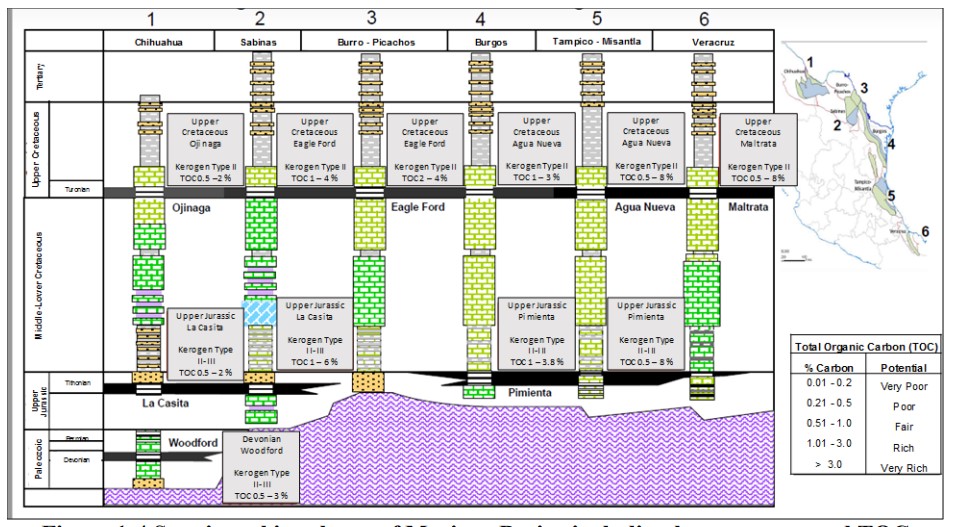 Figure 2. Stratigraphic column of Mexican Basins including kerogen type and TOC (PEMEX E&P, 2012)