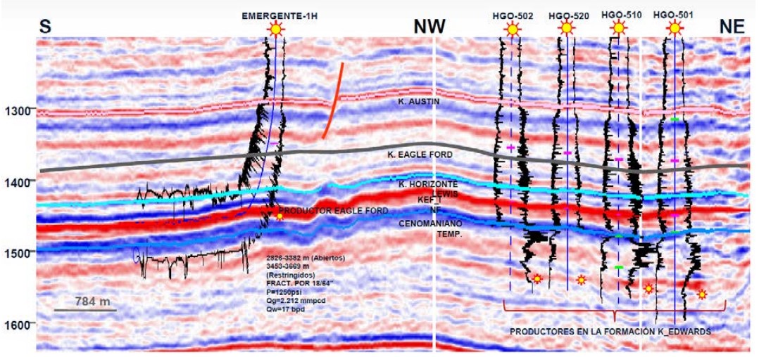 Figure 3. Seismic view including well Emergente-1 and comparison with wells drilled through the Eagle Ford shale in Texas, USA, including GR and Sonic logs. The U.S. wells produce from the deeper Cretaceous Edwards Formation (PEMEX E&P, 2012).
