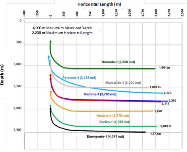 Figure 4. Horizontal length and depth of exploration wells drilled in the Eagle Ford shale (PEMEX E&P, 2014).