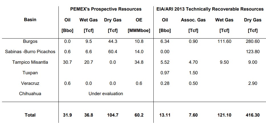 Table 2. Estimated Shale gas and shale oil resources based on studies carried out by PEMEX (2012) and EIA/ARI (2013).