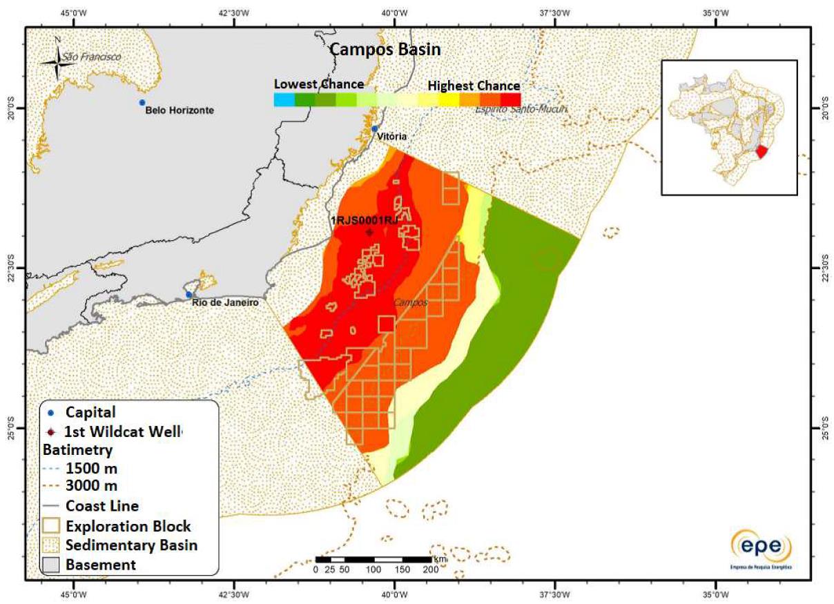 Figure 4. Map of the Probabilistic Effective Basin of Campos, indicating the chances of discoveries in the basin. Source:Modified and Translated from EPE (2019).