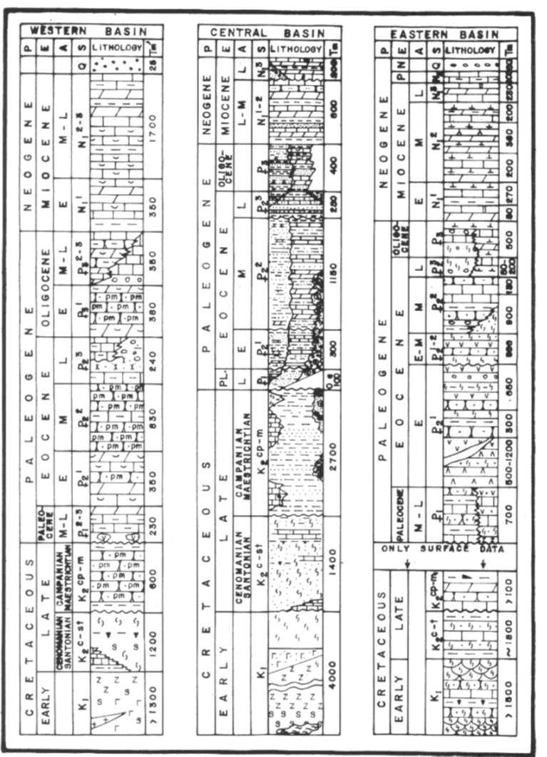 Fig.2. Stratigraphic columns for the cretaceous-Tertiary basins in the Southern Province