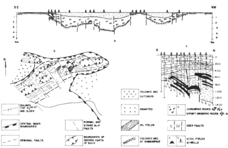 Fig.3. The Central Basin, Southern Province: (a) general cross-section; (b) structural map; (c) geological section of the Cristales oilfield