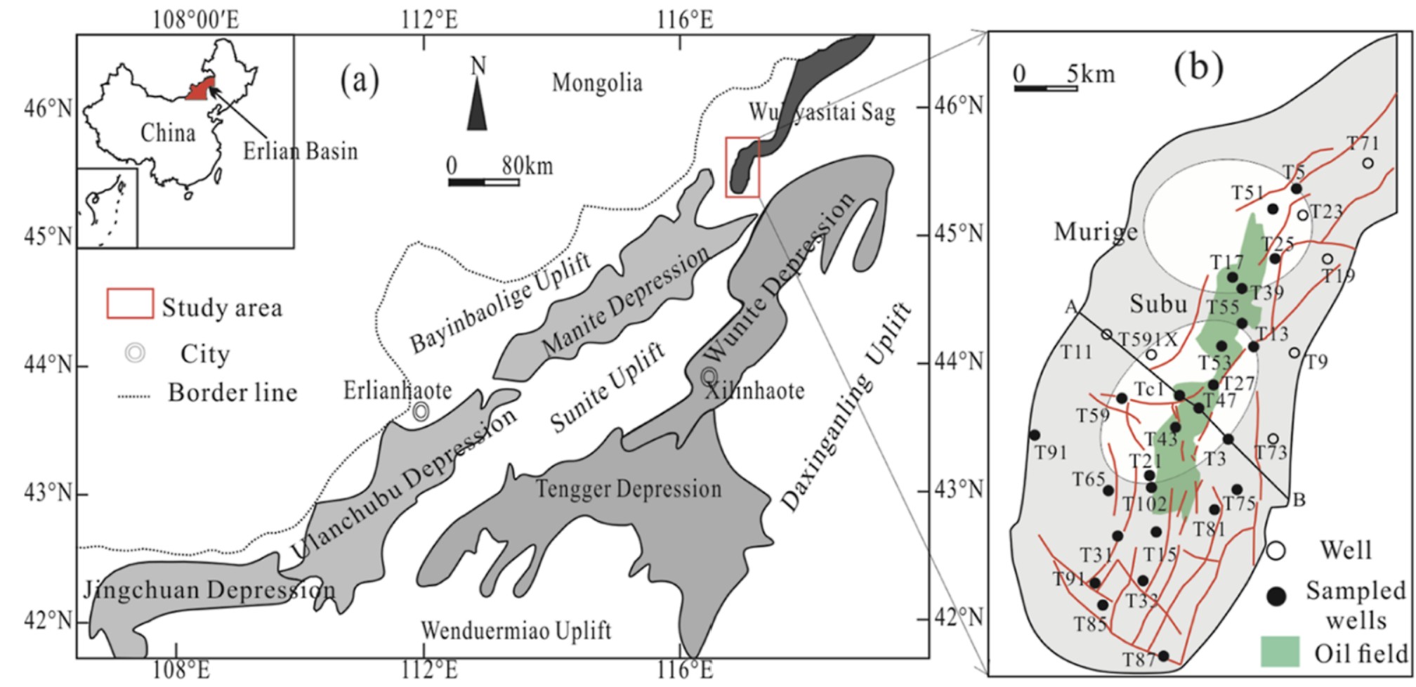 Figure 1. (a) Regional geological map of the Wuliyasitai sag (b) distribution of the sampling wells;