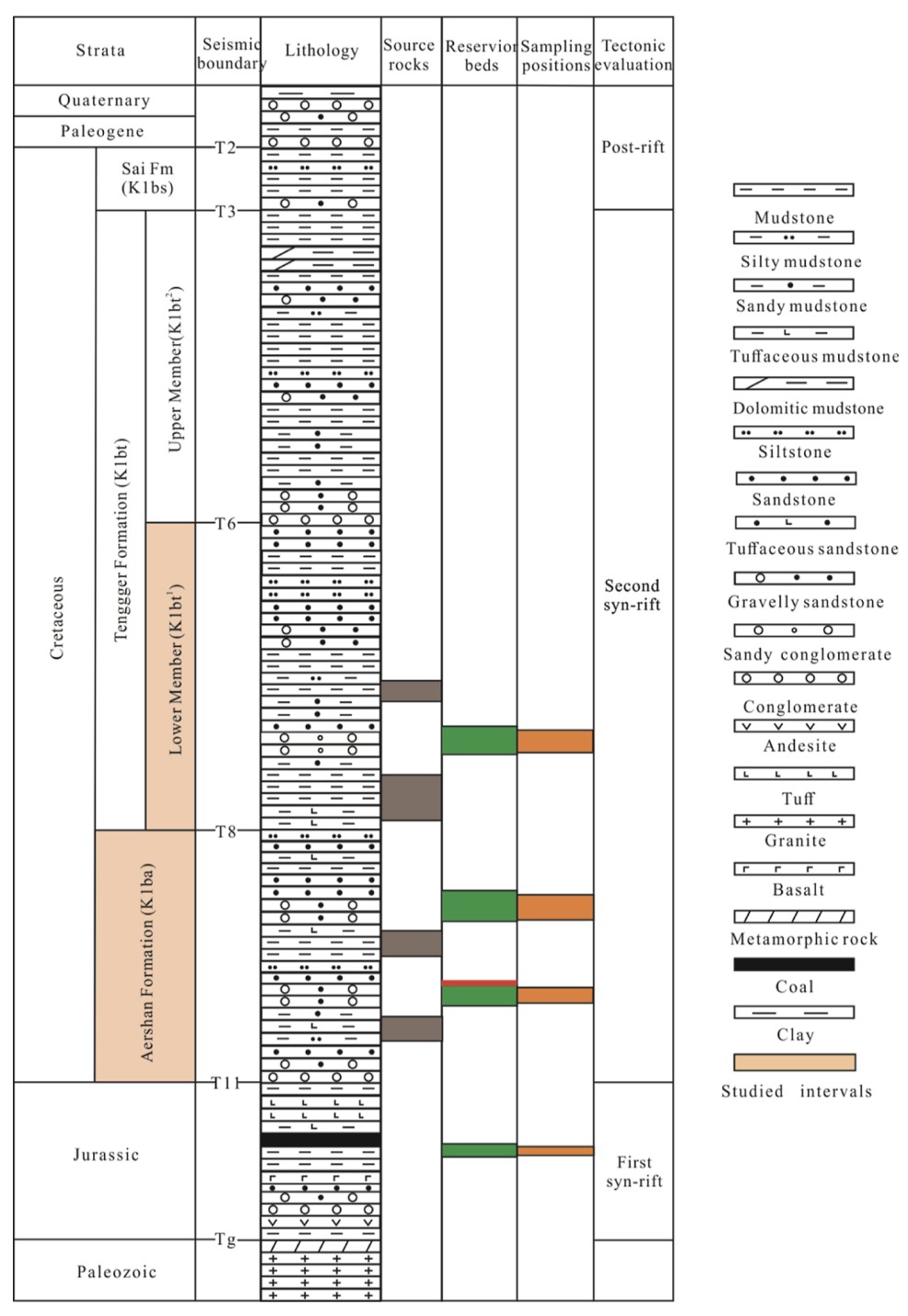 Figure 2. Generalized chronostratigraphy and lithostratigraphy for the Wuliyasitai southern sub-sag showing the investigated reservoir beds and sampling positions. Sai Fm = Saihantala Formation.