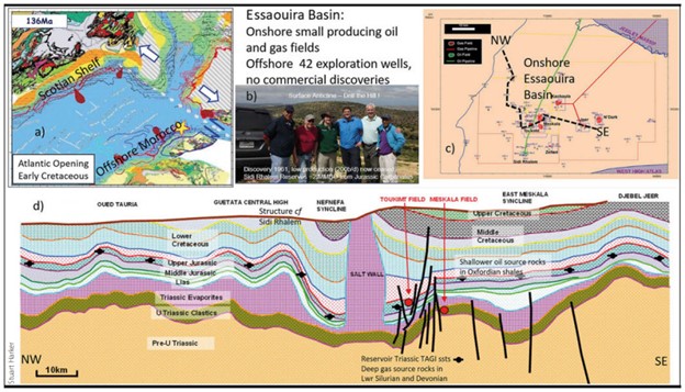 Figure 1: Essaouira Basin onshore and offshore: a) Offshore Morocco Early Cretaceous opening of the Atlantic Ocean. b) Sidi Rhalem onshore field surface anticline – field trip photo. c) Onshore Essaouira fields and pipelines. d) NW–SE geoseismic cross-section.