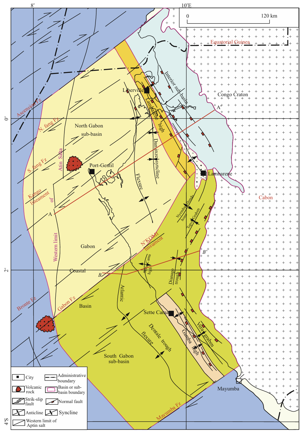 The Gabon Coastal Basin lies within the passive continental margin of West Africa between north latitude 1° and south latitude 4°, bounded to the east by basement and to the west by the 200 m isobath in the Atlantic Ocean. The total basin area is about 128 376 km2 (Lin et al., 2010; Liu J P et al., 2008; Guan and Li, 2007; Xiong et al., 2005; Tong and Guan, 2002).