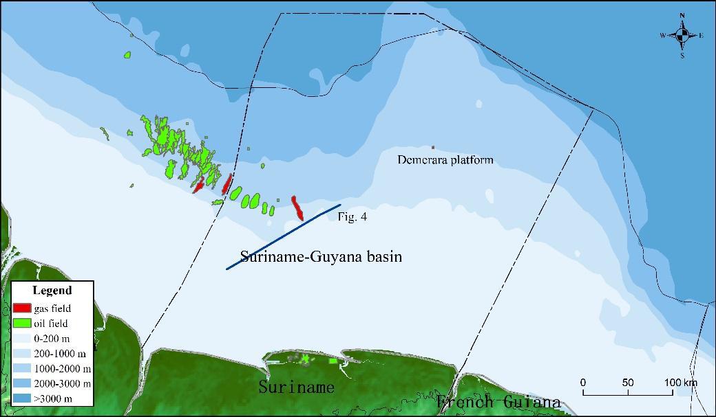 Fig. 3.Oil and gas fields and the location of study area in Suriname-Guyana Basin
