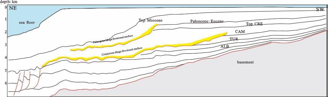 The Upper Cretaceous Coniacian-Mid Campanian marks the transition of a transgressive to a regressive system with increasing sediment input from the south west, creating a broad delta plain environment across the shallow offshore area. A shelf margin zone could not be identified for this sequence as no clear clinoforms/foresets were evident on the seismic data, possibly because they have been removed by the Cretaceous Mega erosional event which created a cut and fill system in this area (Fig. 5). The shallow offshore area is dominated by a delta plain environment and gradually transitioning to a neritic environment. The regression continued during Mid Campanian-Maastrichtian which is characterized by tremendous sediment input in the west creating a broad delta plain across the shallow offshore area. Overall, this sequence is characterized by a transition from delta plain to neritic environments similar to the underlying Mid Campanian-Maastrichtian.