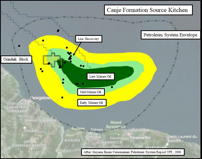 The Canje Formation source rock (Fig. 2) consists dominantly of organic-rich black mudstones with Total Organic Carbon (TOC) contents ranging from 2% to 5%. Values as high as 20% have been measured in equivalent Cenomanian to Santonian age black mudstones drilled during ODP Leg 207 (Erbacher, 2004) on the Demerara Plateau. Source rocks are dominantly algal Type II marine organic material with increasing terrestrial components in nearshore locations. Equivalent age source rocks of the Guyana Suriname Basin are now within the oil generation window with many ‘shows’ of oil and gas from several wells indicating the presence of hydrocarbons (Ginger, 1990). In this portion of the Guyana Suriname basin, the top of the oil window may be near 3,500 meters based on a locally higher thermal gradient than other areas in the basin. The mature pod of Cretaceous source rocks is located offshore in an area of the basin along the Guyana and Suriname coast (Fig. 6). This source rock is up to 550 meters thick. Migration to the producing oil fields onshore has been primarily lateral and updip for 100 to 150 kilometers (Ginger, 1990; Staatsolie.com, 2016).