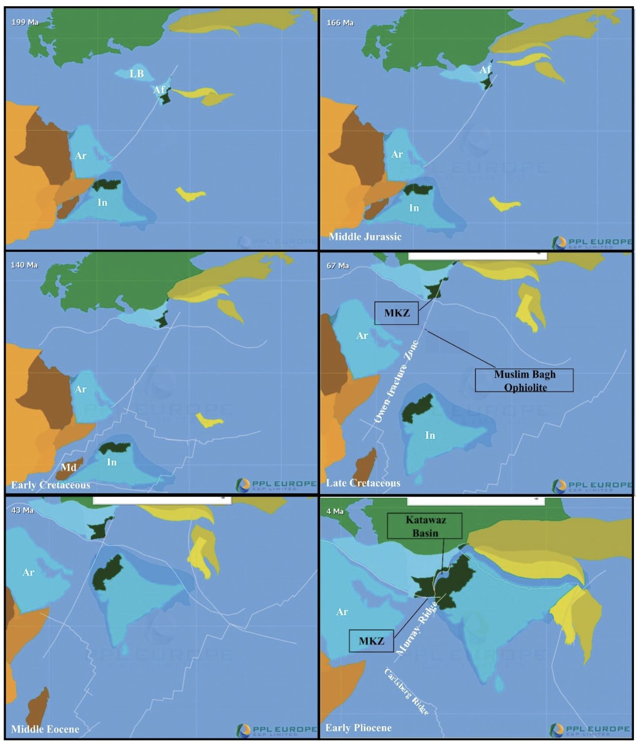 Figure-2 Plate Reconstruction of Indian Plate (PPL In-house Project). “In” for Indian Plate, “Ar” for Arabian Plate, “Af” for Afghan Block, “LB” for Lut Block, “MKZ” for Makran Subduction Zone . (PPL In-House G-Plate Project)