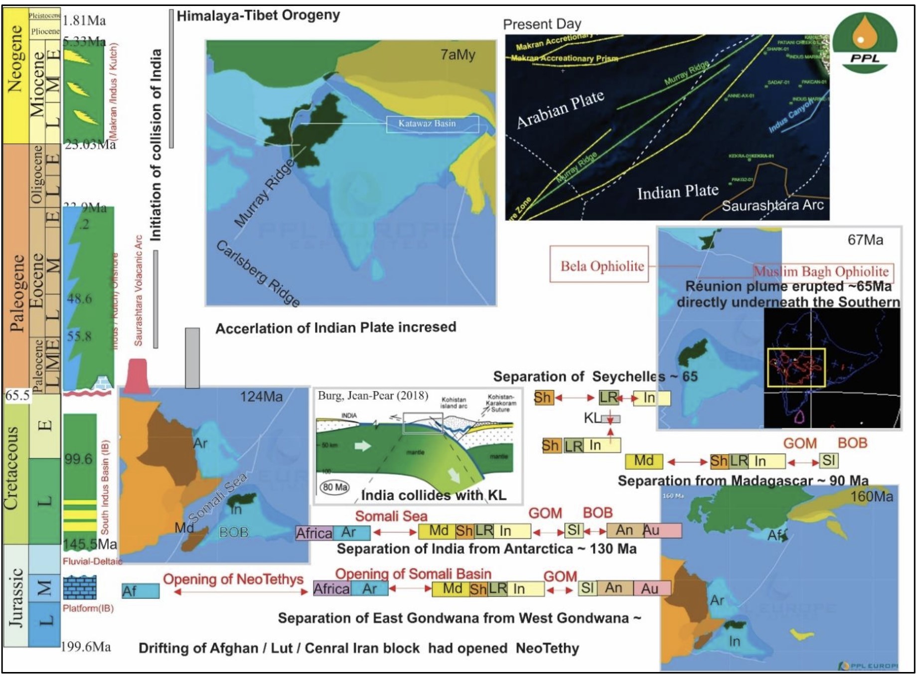 Figure-3. Major tectonic episodes of Indian from Gondwanaland to Asia showing sequential rifting of the Indian plate from Gondwanaland and its subsequent collisions Asia and development of Pakistan Offshore. “In” for Indian Plate, “Ar” for Arabian Plate, ‘An” for Antartica, “Au” for Australia, “Sr” for Siri Lanka, “Af” for Afghan Block, “KL” for Kohistan Ladakh , ‘Md” for Madgascar, “Sh” for Seychelles, “LR” for Laxmi Ridge, “GOM” for Gulf of Mannar and “BOB” for Bayof Bengal. (PPL In-House G-Plate Project)