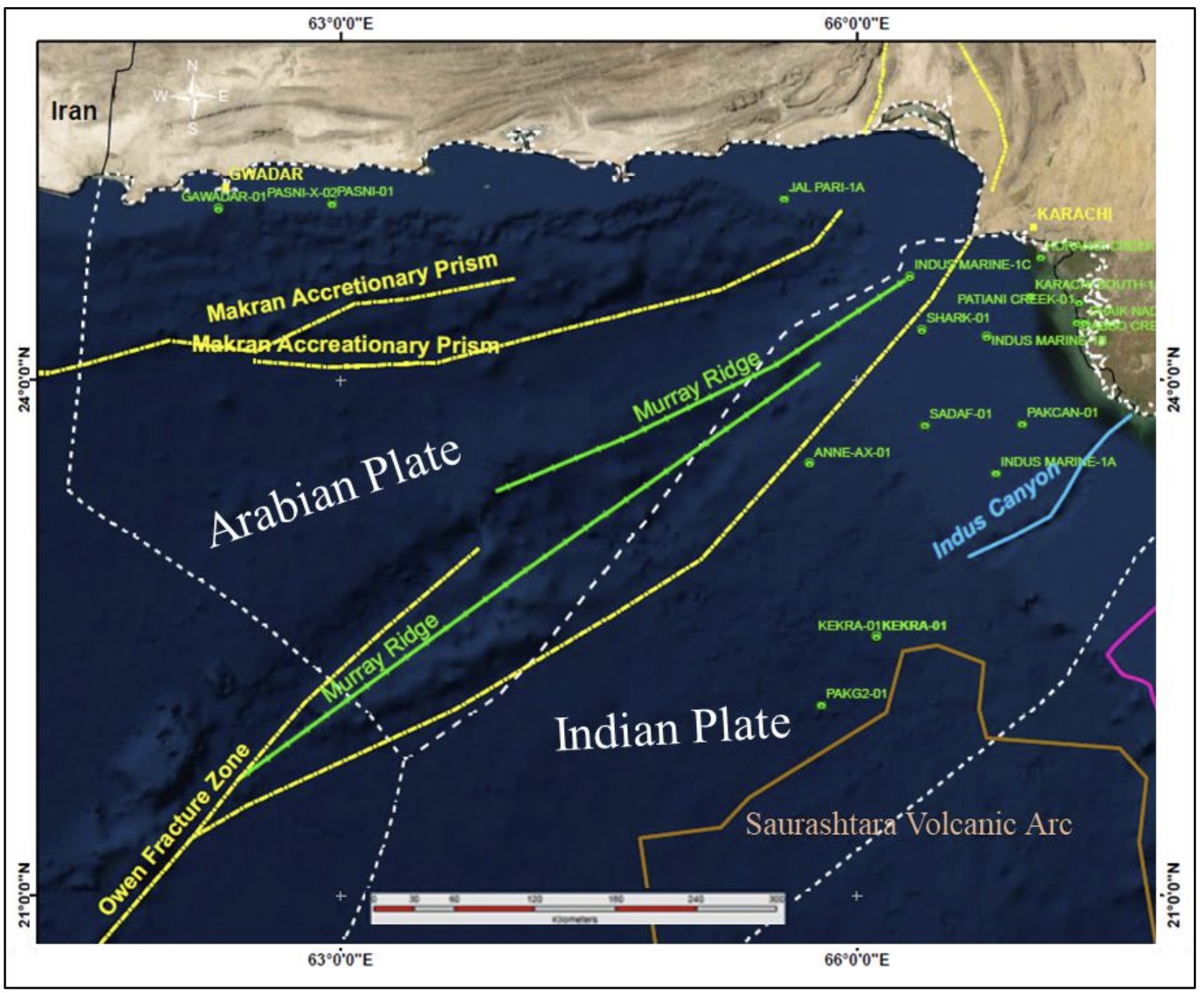 The geographical boundaries of this Indus Offshore are (i) the Murray Ridge to the northwest (ii) the present coastline to the northeast (iii) the abyssal plain of the Arabian Sea to the southwest and (iv) The maritime boundary between Pakistan and India to the east. The basin has three major tectonics plays namely as (i) Indus Delta Play (ii) Shelf Edge Carbonate Play (iii) Carbonates buildup over volcanic mounds in deep waters.