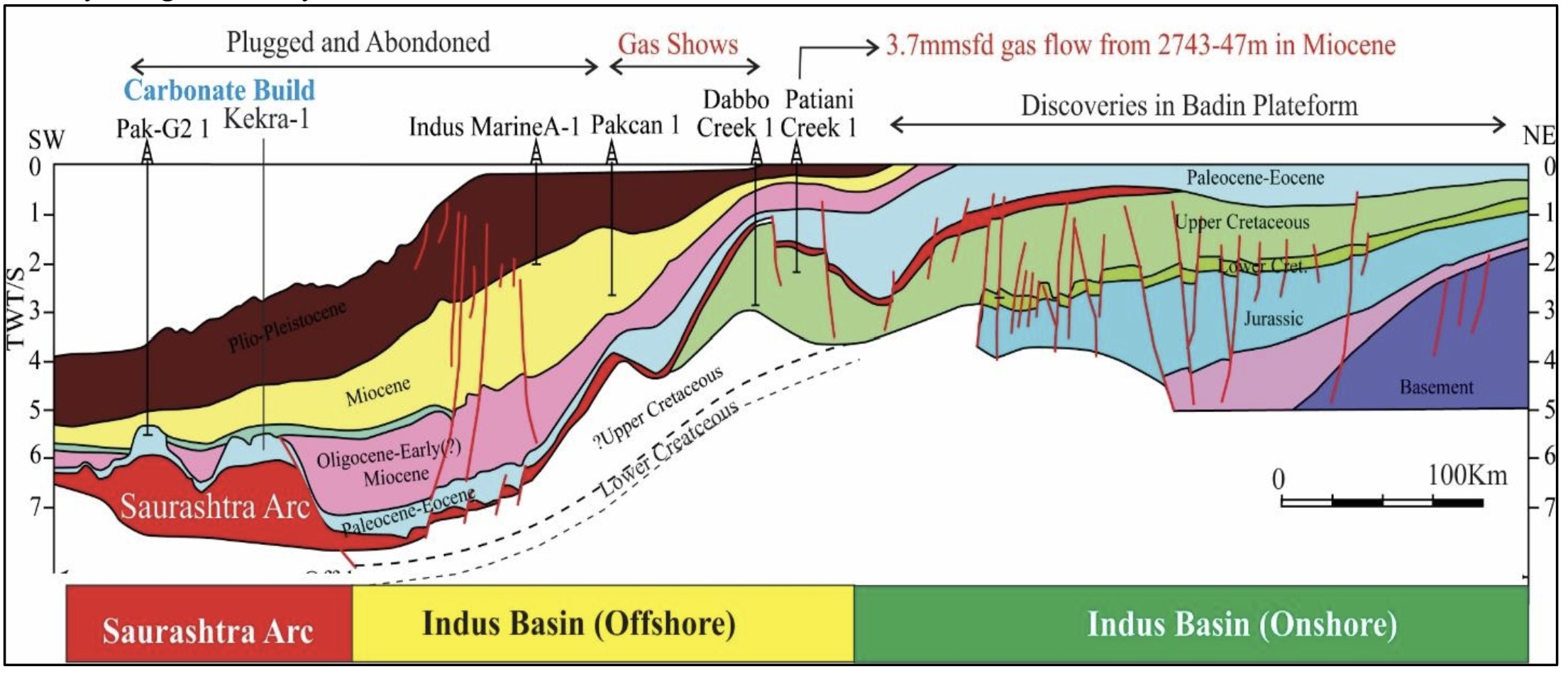 The offshore Indus is passive and rift basin bounded on the north by the Badin Platform of Southern Indus Basin, Murray Ridge in east and to the south by the Saurashtara Arch. Continental crust is interpreted by previous worker as deep rift geometries for the area. Arial extension Indus Offshores Exclusive Economic Zone (EEZ) is 157,169 sq. km2. Indus Offshore is Atlantic type Passive margin basin. So far 13 wells were drilled in Indus Offshore. Pak 2-1 and Kekra-1 are drilled nearby the Saurashtara Volcanic Arch and could not be considered as part of Indus Offshore properly because thick Late Cretaceous basalt is present Fig.-4 is showing the wells drilled in Indus Offshore and adjacent Kutch Offshore basin.