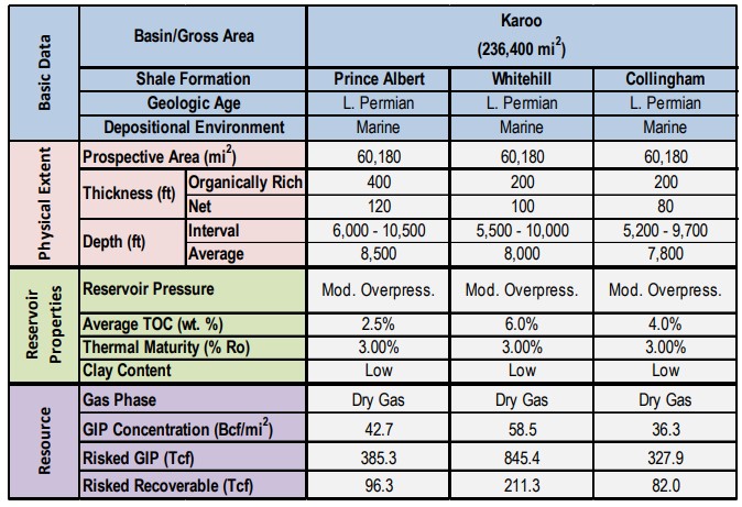 Prince Albert Shale. Within its 60,180-mi2 dry gas prospective area, the Prince Albert Shale has a resource concentration of about 43 Bcf/mi2. Given limited exploration data, the risked shale gas in-place is estimated at 385 Tcf. Based on favorable TOC and reservoir mineralogy, balanced by complex geology and volcanic intrusions in the prospective area, ARI estimates a risked, technically recoverable shale gas resource of 77 Tcf for the Prince Albert Shale in the Karoo Basin.