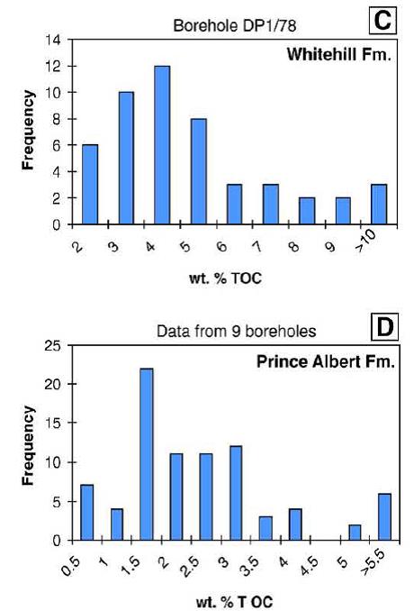 The total organic content (TOC) of the Prince Albert Shale within its organic-rich net pay interval ranges from 1.5 to 5.5%, averaging 2.5%, Figure 7. Local TOC values of up to 12% have been recorded. However, in areas near igneous intrusions much of the organic content may have been lost or converted to graphite.