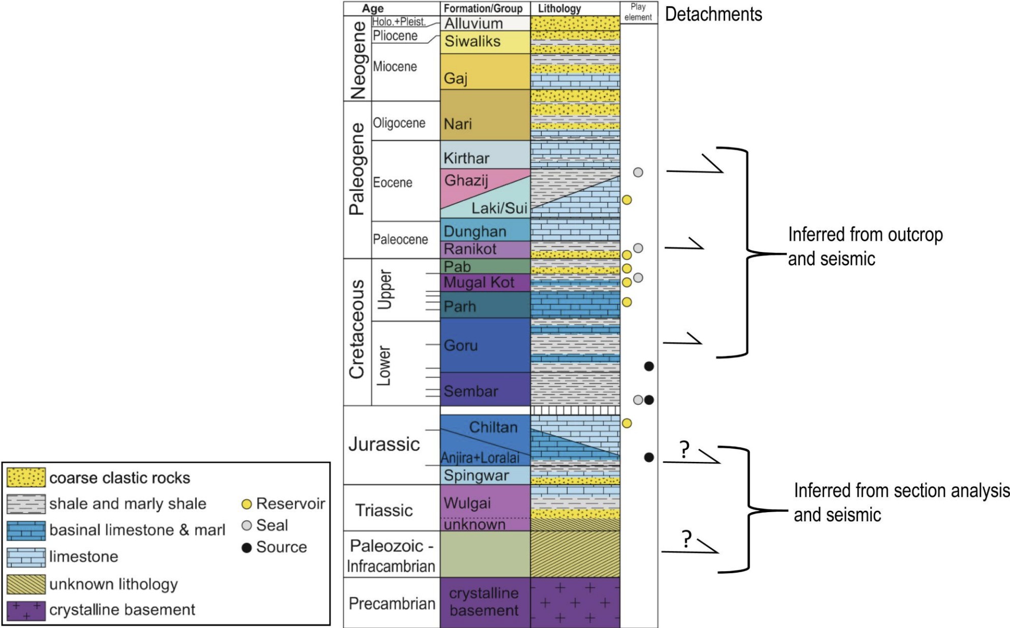 The stratigraphic succession of the study area is displayed in Figure 2. This succession is the result of the deposition on the northeastern margin of the Indo-Pakistani plate which developed as part of the northern margin of Gondwana until Triassic/Early Jurassic (Kadri, 1995, and references therein). The study area is approximately situated on the long lived hinge area from the stable shelf to the more extended margin (e.g., Smewing et al., 2002). The oldest rocks outcropping in the wider study area are from the Jurassic and the deepest drilled strata is the Triassic Wulgai Formation. Rocks older than Triassic are only known from distant wells and outcrops. From a mechanical point of view there are several weak horizons observed in the field that display potential detachment horizons, as marked in Figure 2. Additionally, detachment horizons are inferred from seismic interpretation and geometrical analysis, also marked in Figure 2.