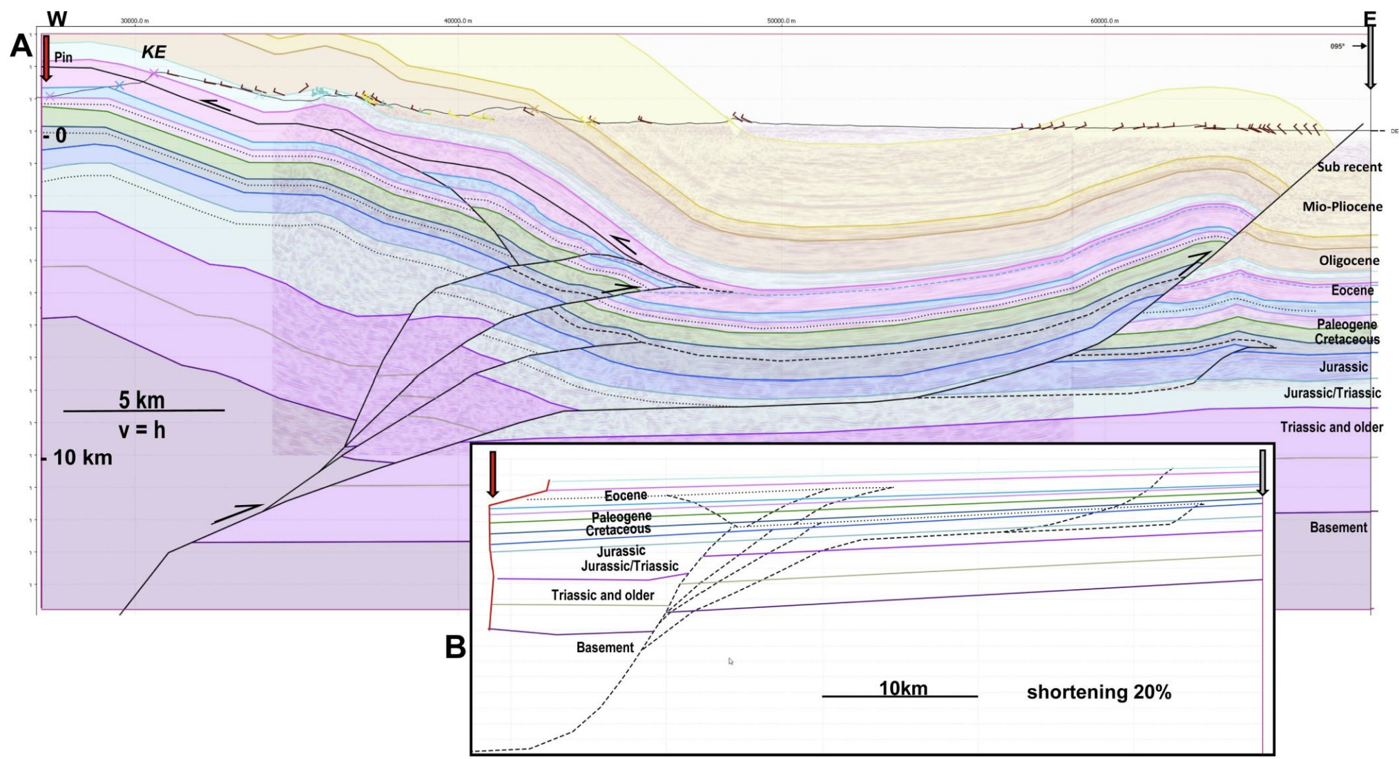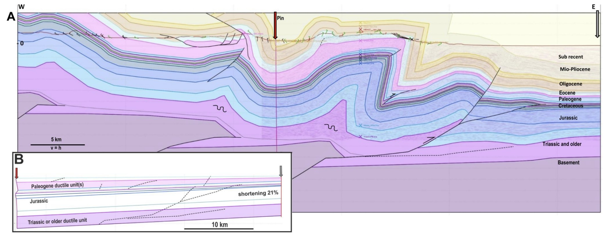 The northern sector is folding-dominated. No major thrust faults are observed at the surface. The depth to detachment analysis of the main fold on the section indicate a decollement at approximately 9 km below sea level. However, the anticline shows an uplift of regional elevation towards the west, as strata in the syncline west of the anticline is at higher elevation than in the foreland. This uplift is associated with an inverting fault underneath. Towards the deformation front a small triangle zone is present; it is cut by a subsequent thrust fault with a fault-propagation fold on top. The relative timing is constrained by growth strata. The detachment level of the thrust fault is clearly below Jurassic rocks, as these have been drilled in the hanging wall of the fault-propagation fold.