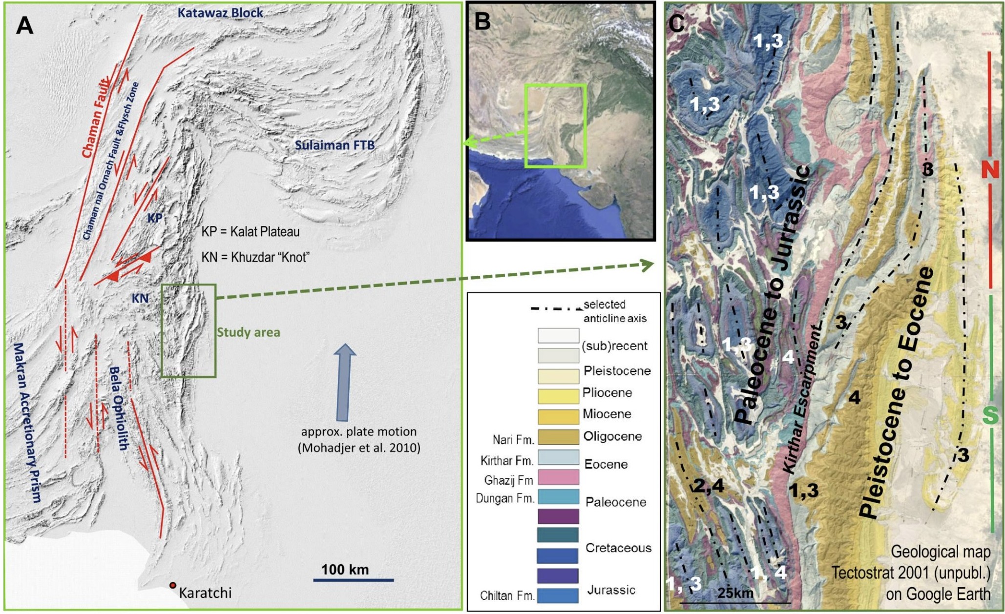 The Kirthar Fold Belt is part of the lateral mountain belts in Pakistan linking the Himalayan orogeny with the Makran accretionary wedge. This region is deforming very obliquely, nearly parallel to the regional plate motion vector (Figure 1, Mohadjer et al., 2010). The Chaman fault (Figure 1A), a largescale strike-slip fault, is considered to represent the lithospheric plate boundary (transform fault) in this lateral collision zone (Bannert et al., 1992). East of the plate boundary, a 150-200-km-wide deformation zone is present (Bannert et al., 1992; Szeliga et al., 2009).