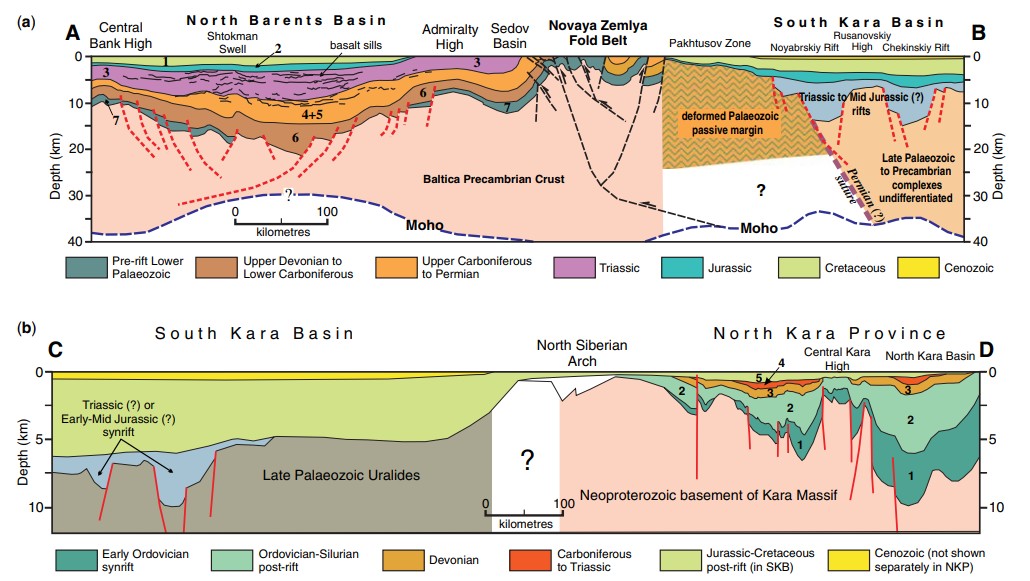 Схематические геологические разрезы, основанные на переинтерпретации данных глубинной сейсмической отражательной и рефракционной разведки, полученных и опубликованных SMG (Шаров и др., 2005; Иванова и др., 2006): (а) через Восточно-Баренцевский и Южно-Карский бассейны на основе сейсмического разреза 2-AP, (б) через Северо-Карскую провинцию на основе сейсмического разреза 3-AP. Местоположение показано на рисунках 3 и 5. Жирным шрифтом выделены числа от 1 до 6 на рисунке (а) и от 1 до 5 на рисунке (б), обозначающие сейсмостратиграфические единицы