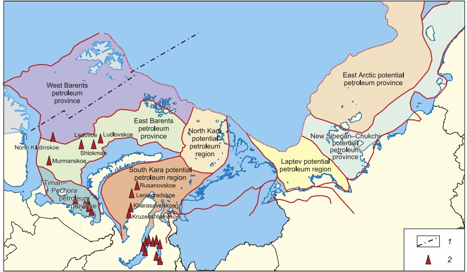 Нефтепромысловые провинции российского арктического шельфа. 1. Предполагаемая граница между Норвегией и Россией; 2. Месторождения углеводородов.