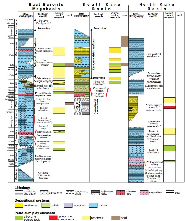Сводная диаграмма тектоностратиграфии и элементов нефтегазоносных районов Баренцево-Карского региона.