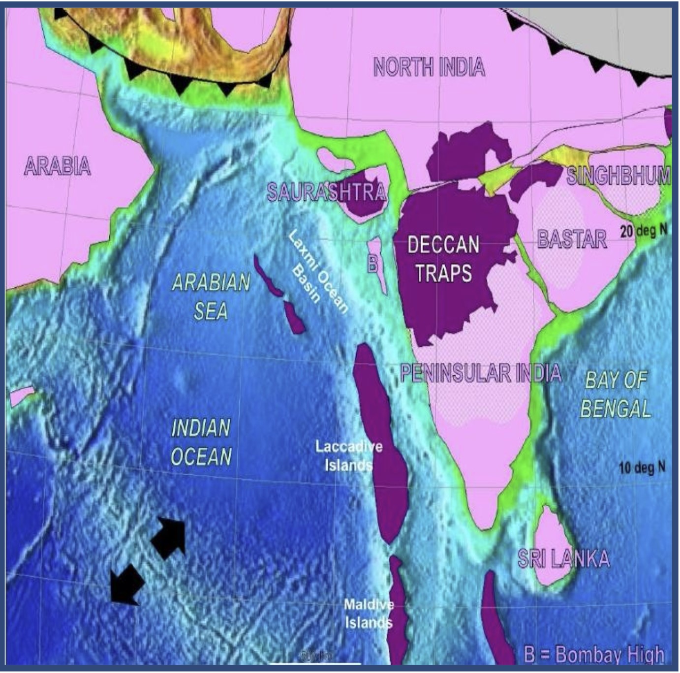Figure 1: Location and morphology of the Kerala-Konkan Basin in the southwest coast and southern tip off India. The basin is affected by the basalt flood events near its K/T boundary