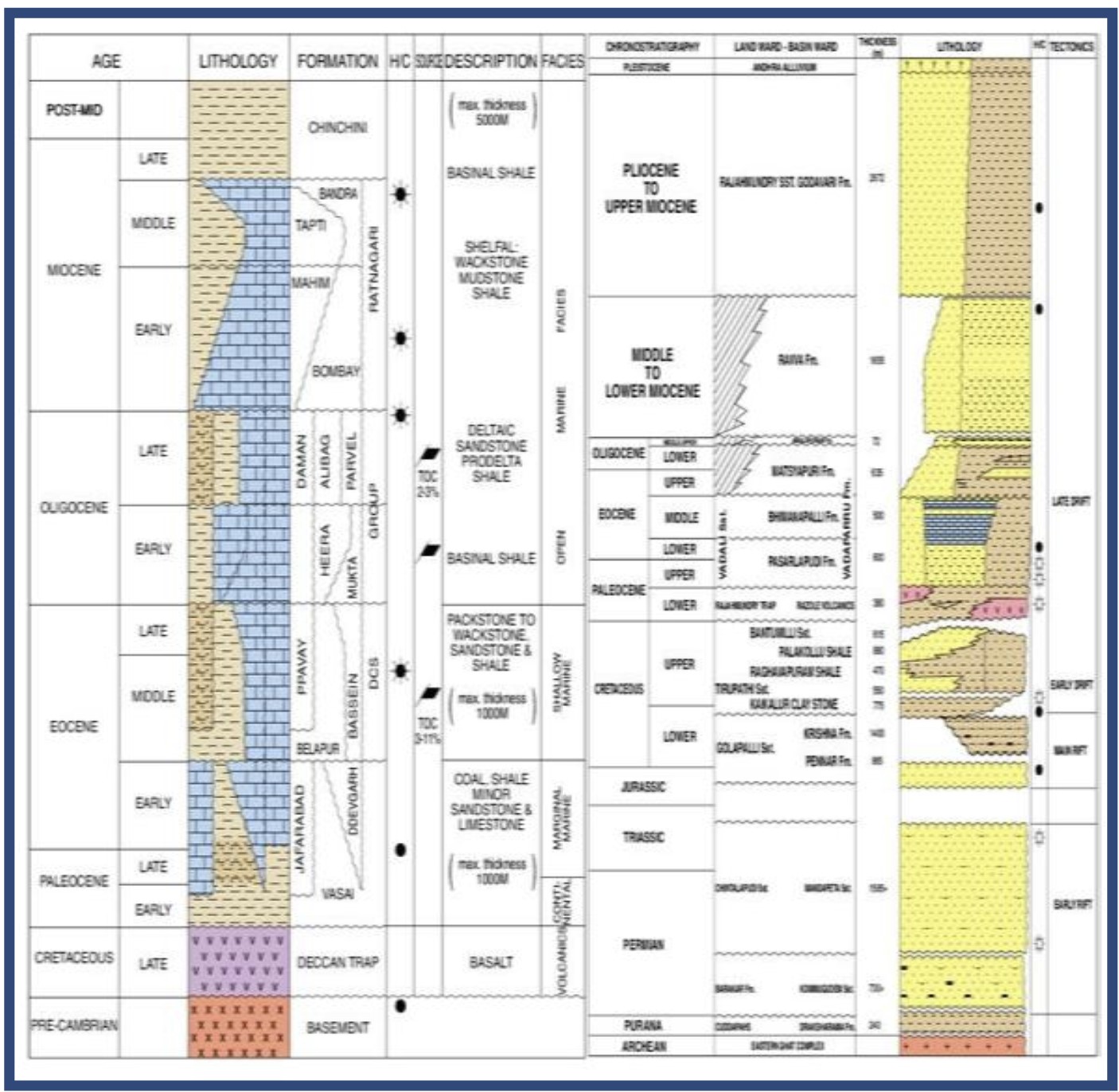 The litho-stratigraphy of the basin explains two different events of sedimentation before and after the Deccan basalt eruption, these are: (i) Sandstone dominated continental deposition (ii) Sandstone, shale and coal dominated deltaic/ marginal marine deposition (iii) Sand, shale and limestone dominated marine deposition (Shah et al, 2009). Sediments which are above the basalt are alteration of clastic and carbonate sediments. Lithology is mainly affected by marine transgressions, regressions pulses and Tertiary column sedimentation is mostly under the influence of Himalayan uplift.