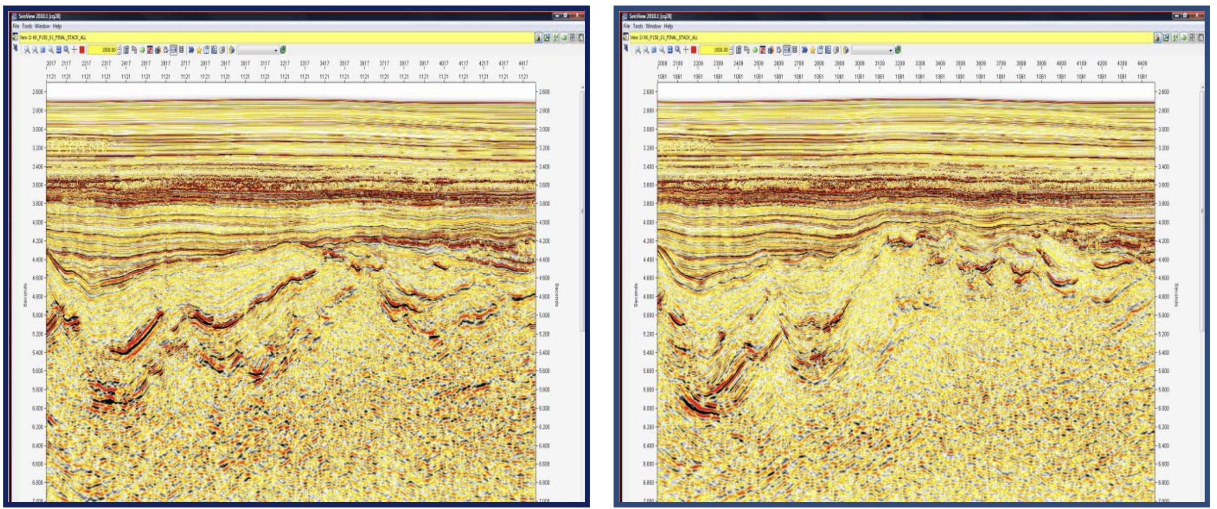 The modern technology seismic over-under reveals many distinct characteristics within the Tertiary and Mesozoic sections (see Figs. 3 & 4). Furthermore strong amplitude events are seen deep seated within the Mesozoic layers and a remarkable change in seismic bandwidth differentiates the Tertiary from the Mesozoic strata