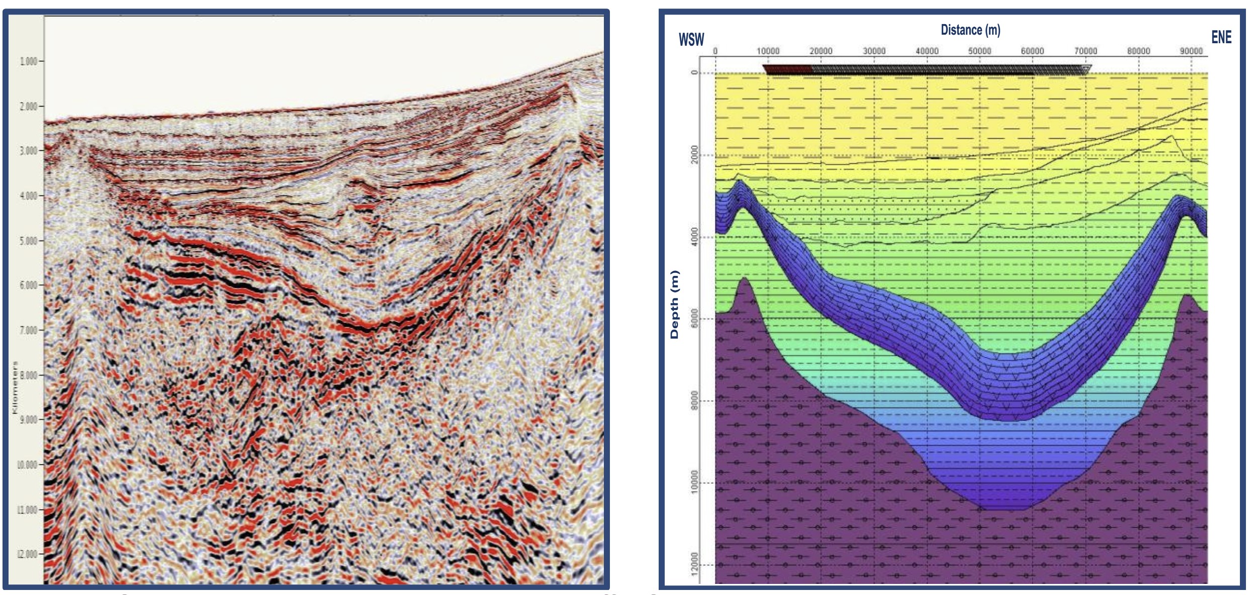 In deepwater there are two rather distinct lithologies that were shaped before and after the Deccan flood basalt events. Modeling of a basin in two dimensions representing a reasonable cross-section of the focused portion of the basin, requires the basic geometry elements of the basin. These were obtained as per the description above with experimental offshore regional dip seismic lines acquired with state-of-theart technology and processed synthesized by Kirchhoff PSDM depth migration (Fig. 5), along with a synthetic seismogram based on density data (Fig. 6). Thickness of the basalt and the sub-basalt sediments are therefore based on the synthetic seismogram and on the interpretation of seismic section.