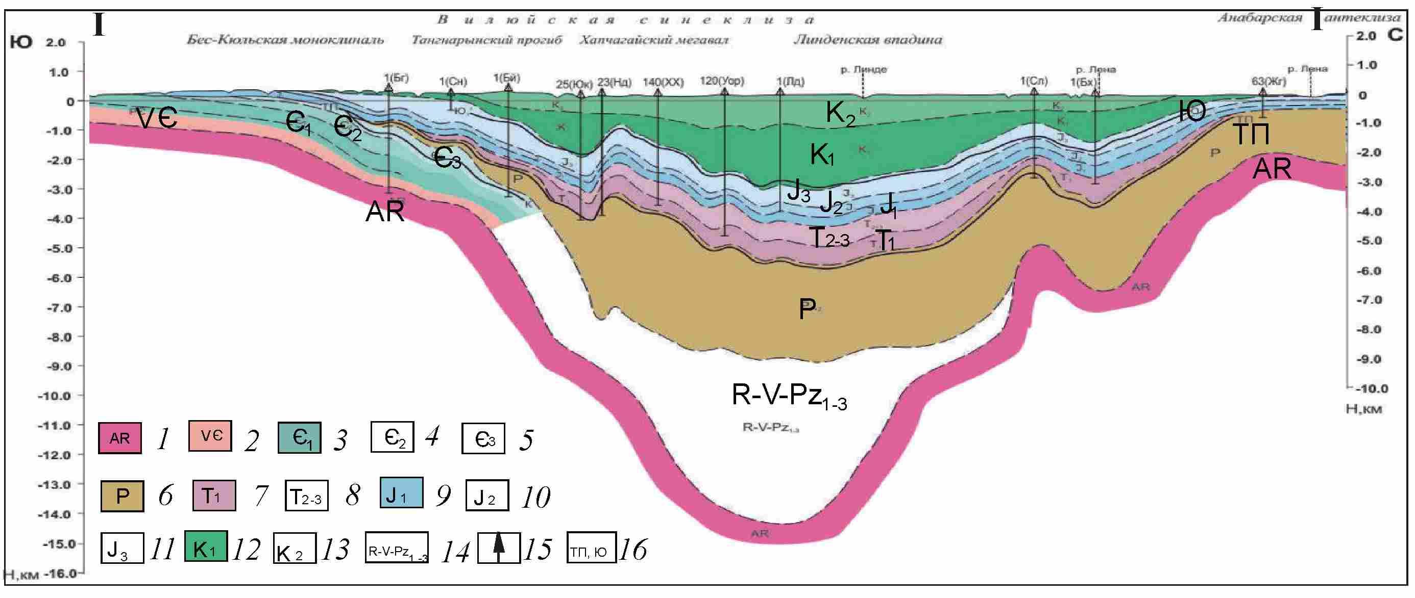 1 – фундамент; возраст отложений: 2 – венд-кембрий; 3 – нижний кембрий; 4 – средний кембрий; 5 – верхний кембрий; 6 – пермь; 7 – нижний триас; 8 – средний-венрхний триас; 9 – нижняя юра; 10 - средняя юра; 11 – верхняя юра; 12 – нижний мел; 13 – верхний мел; 14 – нерасчлененные отложения; 15 – профиль скважины; 16 – отражающие горизонты.