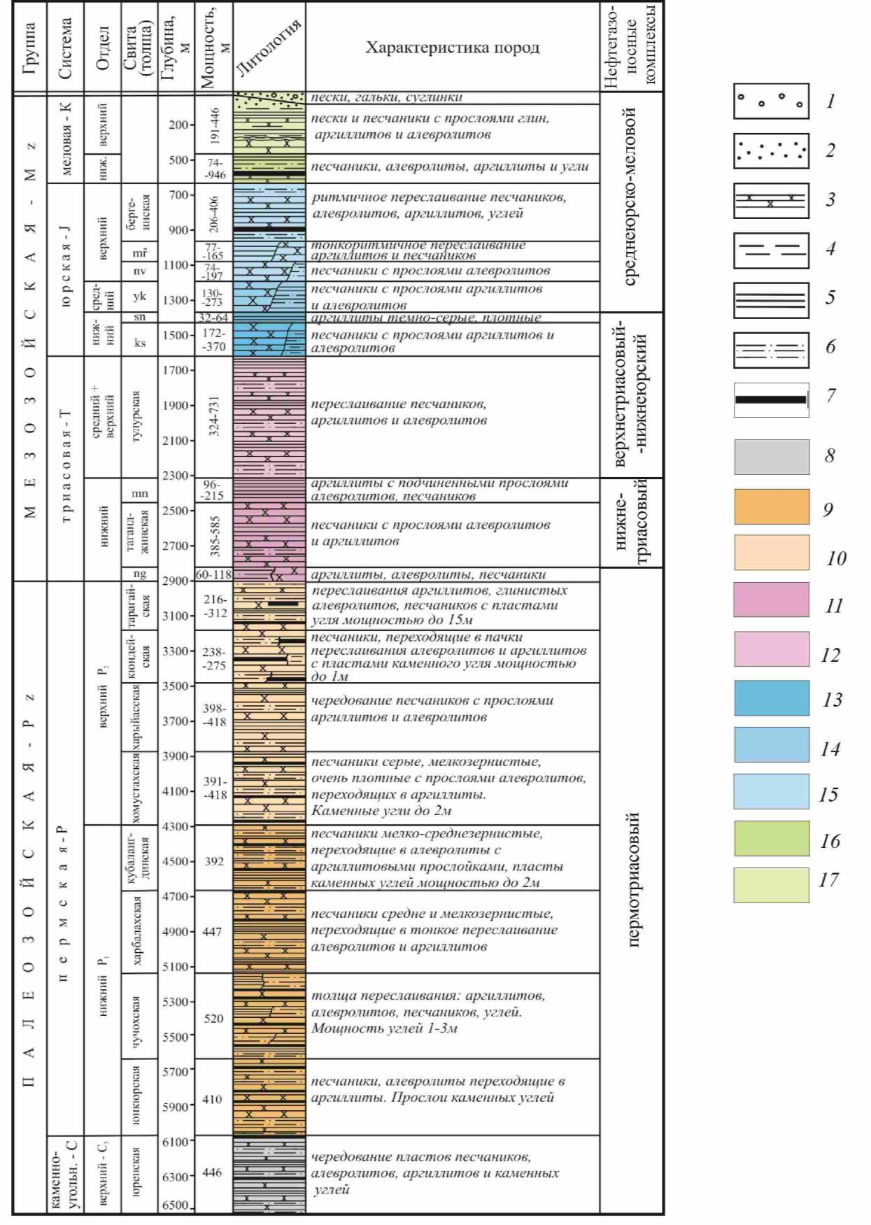 1 – галечники, 2 – пески, 3 – песчаники, 4 – глины, 5 – аргиллиты, 6 – алевролиты, 7 – каменные угли; возраст отложений (система): 8 – каменноугольная, 9 – пермская (нижний), 10 - пермская (верхний), 11 – триасовая (нижний), 12 – триасовая (верхний), 13 – юрская (нижний), 14 – юрская (средний), 15 – юрская (верхний), 16 – меловая (нижний), 17 - меловая (верхний)