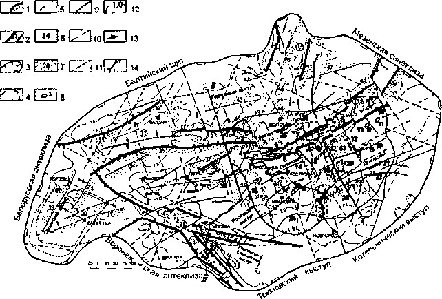 Границы: 1 — Московской самостоятельной НГО, 2 — авлакогенов и зон развития рифейских пород, перспективных на поиски залежей нефти и газа в ловушках инверсионных блоков, дизъюнктивного и иного экранирования (цифры в кружках): I — Среднерусский, II — Крестцовский, III — Подмосковный, IV — Пачелмский, V — Воже-Лачский; 3 — установленных очагов генерации главной фазы нефтеобразования; 4 — то же, предполагаемых; 5 — то же, начальной фазы нефтеобразования; 6 — прогнозируемые зоны нефтегазонакопления, более вероятные в венд-палеозойских отложениях: 1 — Крестцовская, 2 — Васьегонская, 3 — Северо-Рыбинская, 4 — Рыбинская, 5 — Южно-Рыбинская, 6 — Западно-Грязо-ветская, 7 — Восточно-Грязоветская, 8 — Западно-Галичская, 9 — Восточ-но-Галичская, 10 — Южно-Рослятинская, 11 — Корнышско-Гагаринская, 12 — Унжинская, 13 — Северо-Решминская, 14 — Костромская, 15 — Ростовская, 16 — Северо-Ивановская, 17 — Южно-Ивановская, 18 — Реш-минская, 19 — Унжинско-Ветлушская, 20 — Восточно-Нейская, 21 — Нейско-Дюковская, 22 — Рождественская, 23 — Высоковская, 24 — Нижнеокская, 25 — Южно-Вологодская, 26 — Сухонская, 27 — Подольско-Егорьевская; 7 — то же, но менее вероятные: 28 — Витебская, 29 — Оршанская, 30 — Северо-Смоленская, 31 — Смоленская, 32 — Валдайская, 33 — Мстинская, 34 — Нелидовская, 35 — Южно-Крестцовская, 36 — Верхневолжская, 37 — Тверская, 38 — Угличская, 39 — Переяславль-Залесская, 40 — Ростовская, 41 — Ярославская, 42 — Черновецкая, 43 — Пестовская, 44 — Вологодская, 45 — Пундугинская, 46 — Воже-Лачская, 47 — Кубанская, 48 - Тотьминская, 49 - Островско-Пучежская, 50 - Кадыйская, 51 — Восточно-Кадыйская, 52 — Чухломская, 53 — Нейская, 54 — Котласская; 8 — локальные структуры: 1 — Рыбинская, 2 — Букаловская, 3 — Даниловская, 4 — Любимская, 5 — Скалинская, 6 — Дьяконовская, 7 — Ореховская, 8 — Солигаличская, 9 — Бурлаковская, 10 — Бабушкинская, 11 — Александровская, 12 — Тевигинская, 13 — Белиховская, 14 — Рослятинская, 15 — Подболотная, 16 — Зеленцовская, 17 — Харинская, 18 — Городищенская, 19 — Бобровская, 20 — Южно-Бобровская, 21 — Качусская, 22 — Карнышская, 23 — Гагаринская. 24 — Шохринская, 25 — Батаевская, 26 — Георгиевская, 27 — Рождественская, 28 — Нейская, 29 — Озерская, 30 — Капраловская, 31 — Высоковская, 32 — Шеве-ловская, 33 — Карельская, 34 — Сокольская, 35 — Приволжская, 36 — Плеская, 37 — Ильинская, 38 — Аньковская; линии установленных разломов (зон развития дизъюнктивных нарушений): 9 — листрической природы, 10 — сдвиговой природы, 11 — изостатического выравнивания; 12 — изогипсы поверхности фундамента, км; 13 — направление миграции УВ; 14 — линии геологических профилей