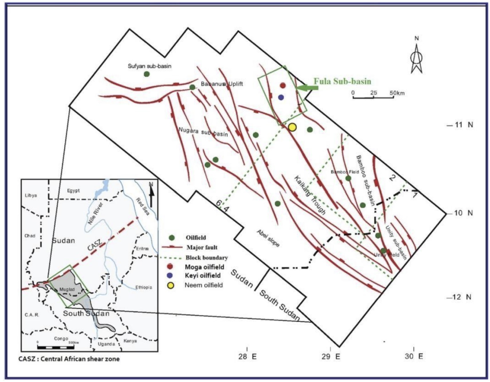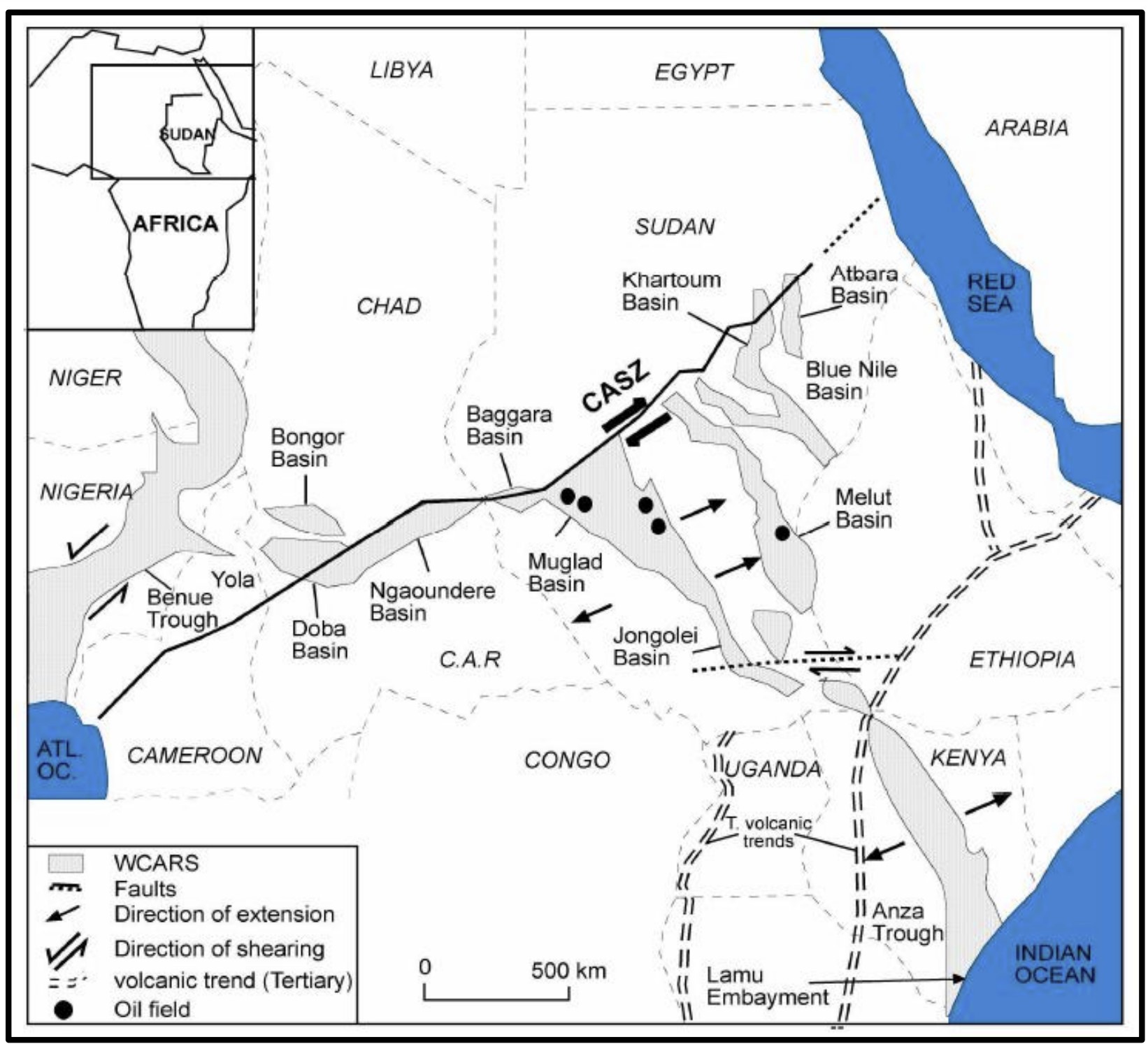 Rift related basins in Sudan developed in the late Jurassic as a result of separation of west and east Gondwana. These rift basins are regionally linked to the Central African Shear Zone (CASZ) which began in late Jurassic (?) and consists of Benue trough in Nigeria, Chad basin in Chad and Muglad basin in Sudan. Muglad basin is part of the trend of Cretaceous sedimentary basins of apparent rift origin related to the global phenomenon of plate tectonics, Figure (5).The southern Sudan interior rift basins are defined by extensive NW–SE, NNW–SSE, N–S, NE–SW, and E–W rifts that started to develop during the late Jurassic to Early Cretaceous time (Schull, 1988). The split-up of the supercontinent Pangea resulted in the formation of the Central African Shear Zone (CASZ), which controlled the orientation of the faults within the basin. The majority of the faults are deep-seated normal faults trending in a NNW-SSE direction perpendicular to the CASZ.