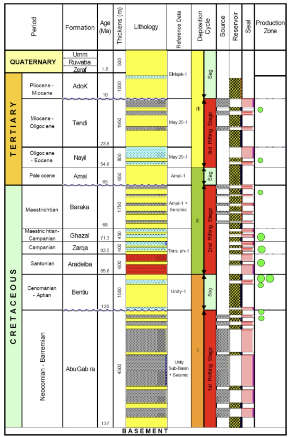 The source rock (lacustrine shale) is characteristic only in the first rifting phase sequence which took place in early Cretaceous while the reservoir sandstones are characteristic in all rift sequences, but the productive zones were found in Bentiu and Aradeiba Formations.