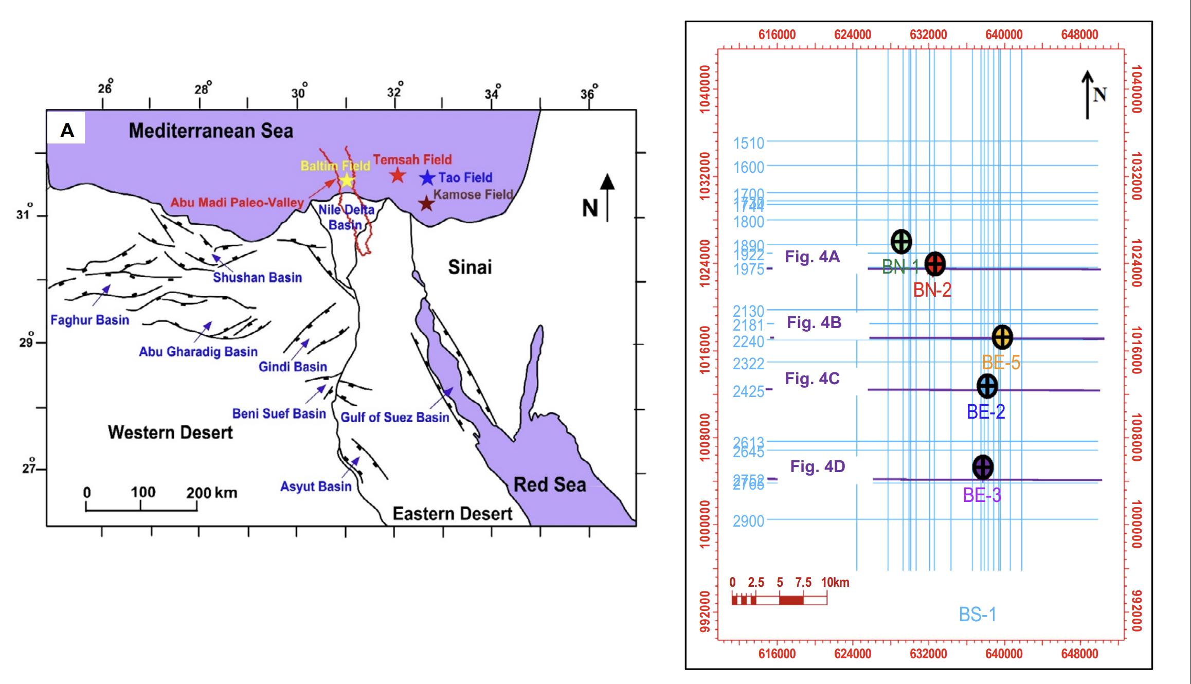 The Baltim Field is the northern continuation of the Abu Madi paleo-valley. It is 500 km2 in size (about 25 km long and 19 km wide) at the offshore section of the NDB and located approximately 25 km from the Egyptian coast between 31.62° and 31.94°N and 31.02° and 31.44°E (Fig. 1).