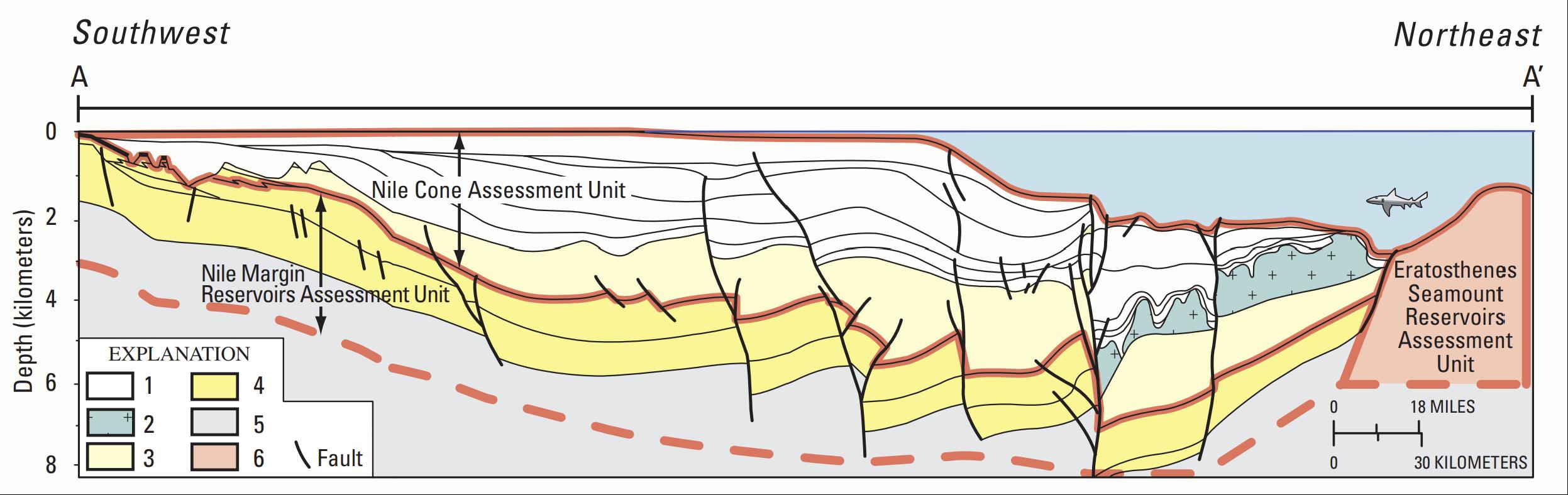 Fig. 4. Schematic geologic cross section of the Nile Delta Basin Province illustrating the geologic definition of three of the four assessment units (AU) in this study (dotted red lines): Nile Margin Reservoir AU, Nile Cone AU, and Eratosthenes Seamount AU. The fourth AU, Mediterranean Ridge, is out of the plane of the cross section. Modified from Barber (1981) and Abdel Aal and others (2000). Location of projected section shown in figure 1. 1, Miocene (post-Messinian) and Pliocene-Quaternary; 2, Messinian Salt; 3, Miocene (pre-Messinian); 4, Paleogene-Cretaceous; 5, hypothesized pre-Cretaceous; 6, Eratosthenes Seamount.