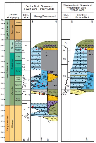 Solid pyrobitumen has also been recorded in other mineral occurrences such as the Citronen Fjord deposit, Peary Land (Van der Stijl & Mosher 1998) and in association with Zn–Pb–Ag occurrences on Washington Land. Here, it is found in the Ordovician succession close to Petermann Gletscher in the east and in the Silurian succession at Kap Schuchert in the west (Jensen 1998). According to von Guttenberg & van der Stijl (1993), bitumen has also been noted in Zn–Pb mineral occurrences in different settings, including Silurian reefs at Kayser Bjerg, Hall Land, in Cambrian carbonate debris flows at Hand Bugt, northern Nyeboe Land and at Kap Wohlge-muth, northern Nares Land (Fig. 3).